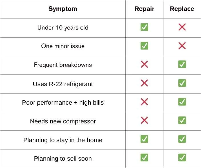 We have created a simple chart to help guide you before calling your HVAC technician. It highlights the key points from this blog so you can better evaluate your system and ask the right questions.